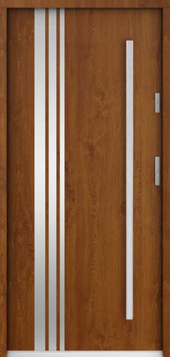 The door is made of stainless steel. Inside it is filled with PUR polyurethane foam and wood. The thickness of the door slab is 2.2 inch. Dual sealing system - one seal is in the dap of the frame and the other is located in the supporting part of the door slab. They reduce vibration and protect your house from losing the heat. They don't change their volume under the influence of atmospheric conditions. The door frame has anti-burglar reinforcements in hinge parts and locking points.