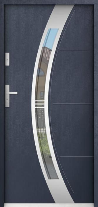 The door is made of stainless steel. Inside it is filled with PUR polyurethane foam and wood. The thickness of the door slab is 2.2 inch. Dual sealing system - one seal is in the dap of the frame and the other is located in the supporting part of the door slab. They reduce vibration and protect your house from losing the heat. They don't change their volume under the influence of atmospheric conditions. The door frame has anti-burglar reinforcements in hinge parts and locking points.