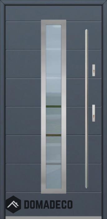 The door is made of stainless steel. Inside it is filled with PUR polyurethane foam and wood. The thickness of the door slab is 2.5 inch. Dual sealing system - one seal is in the dap of the frame and the other is located in the supporting part of the door slab. They reduce vibration and protect your house from losing the heat. They don't change their volume under the influence of atmospheric conditions. The door frame has anti-burglar reinforcements in hinge parts and locking points.