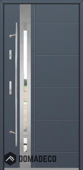 The door is made of stainless steel. Inside it is filled with PUR polyurethane foam and wood. The thickness of the door slab is 2.5 inch. Dual sealing system - one seal is in the dap of the frame and the other is located in the supporting part of the door slab. They reduce vibration and protect your house from losing the heat. They don't change their volume under the influence of atmospheric conditions. The door frame has anti-burglar reinforcements in hinge parts and locking points.