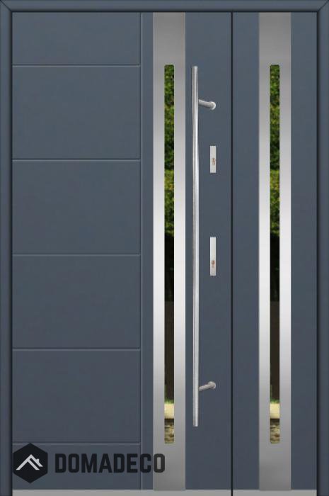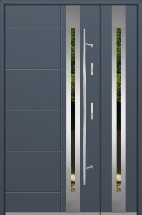 The door is made of stainless steel. Inside it is filled with PUR polyurethane foam and wood. The thickness of the door slab is 2.1 inch. Dual sealing system - one seal is in the dap of the frame and the other is located in the supporting part of the door slab. They reduce vibration and protect your house from losing the heat. They don't change their volume under the influence of atmospheric conditions. The door frame has anti-burglar reinforcements in hinge parts and locking points.