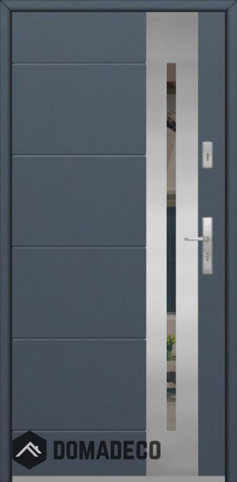 The door is made of stainless steel. Inside it is filled with PUR polyurethane foam and wood. The thickness of the door slab is 2.5 inch. Dual sealing system - one seal is in the dap of the frame and the other is located in the supporting part of the door slab. They reduce vibration and protect your house from losing the heat. They don't change their volume under the influence of atmospheric conditions. The door frame has anti-burglar reinforcements in hinge parts and locking points.