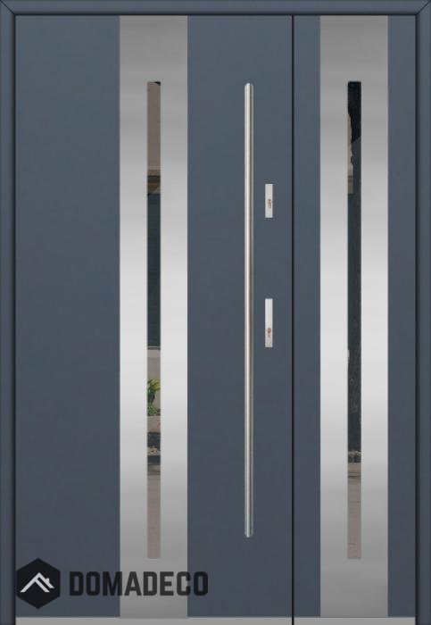 The door is made of stainless steel. Inside it is filled with PUR polyurethane foam and wood. The thickness of the door slab is 2.1 inch. Dual sealing system - one seal is in the dap of the frame and the other is located in the supporting part of the door slab. They reduce vibration and protect your house from losing the heat. They don't change their volume under the influence of atmospheric conditions. The door frame has anti-burglar reinforcements in hinge parts and locking points.