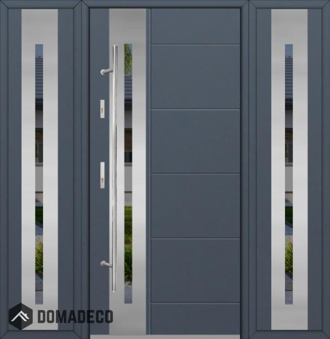 The door is made of stainless steel. Inside it is filled with PUR polyurethane foam and wood. The thickness of the door slab is 2.1 inch. Dual sealing system - one seal is in the dap of the frame and the other is located in the supporting part of the door slab. They reduce vibration and protect your house from losing the heat. They don't change their volume under the influence of atmospheric conditions. The door frame has anti-burglar reinforcements in hinge parts and locking points.