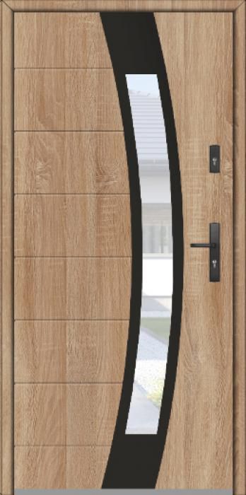 The door is made of stainless steel. Inside it is filled with PUR polyurethane foam and wood. The thickness of the door slab is 2.5 inch. Dual sealing system - one seal is in the dap of the frame and the other is located in the supporting part of the door slab. They reduce vibration and protect your house from losing the heat. They don't change their volume under the influence of atmospheric conditions. The door frame has anti-burglar reinforcements in hinge parts and locking points.