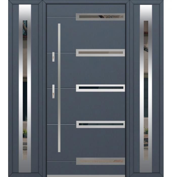 The door is made of stainless steel. Inside it is filled with PUR polyurethane foam and wood. The thickness of the door slab is 2.1 inch. Dual sealing system - one seal is in the dap of the frame and the other is located in the supporting part of the door slab. They reduce vibration and protect your house from losing the heat. They don't change their volume under the influence of atmospheric conditions. The door frame has anti-burglar reinforcements in hinge parts and locking points.
