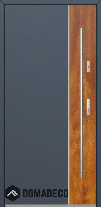 The door is made of stainless steel. Inside are filled with foam and wood. The casing is covered with aluminum.