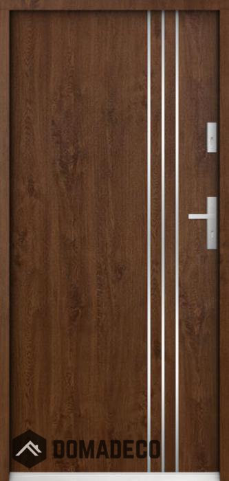 The door is made of stainless steel. Inside it is filled with PUR polyurethane foam and wood. The thickness of the door slab is 2.2 inch. Dual sealing system - one seal is in the dap of the frame and the other is located in the supporting part of the door slab. They reduce vibration and protect your house from losing the heat. They don't change their volume under the influence of atmospheric conditions. The door frame has anti-burglar reinforcements in hinge parts and locking points.