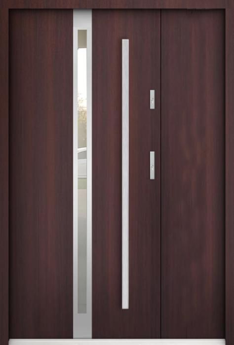 The door is made of stainless steel. Inside it is filled with PUR polyurethane foam and wood. The thickness of the door slab is 2.2 inch. Dual sealing system - one seal is in the dap of the frame and the other is located in the supporting part of the door slab. They reduce vibration and protect your house from losing the heat. They don't change their volume under the influence of atmospheric conditions. The door frame has anti-burglar reinforcements in hinge parts and locking points.