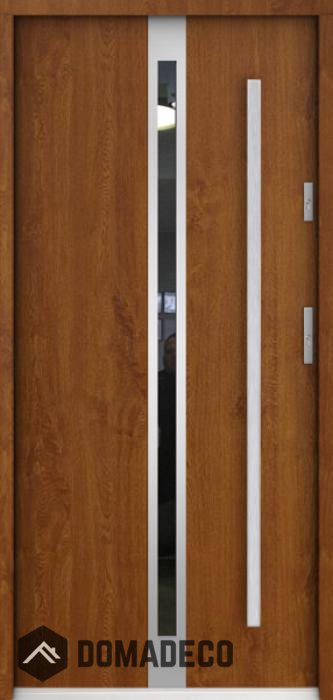 The door is made of stainless steel. Inside it is filled with PUR polyurethane foam and wood. The thickness of the door slab is 2.2 inch. Dual sealing system - one seal is in the dap of the frame and the other is located in the supporting part of the door slab. They reduce vibration and protect your house from losing the heat. They don't change their volume under the influence of atmospheric conditions. The door frame has anti-burglar reinforcements in hinge parts and locking points.