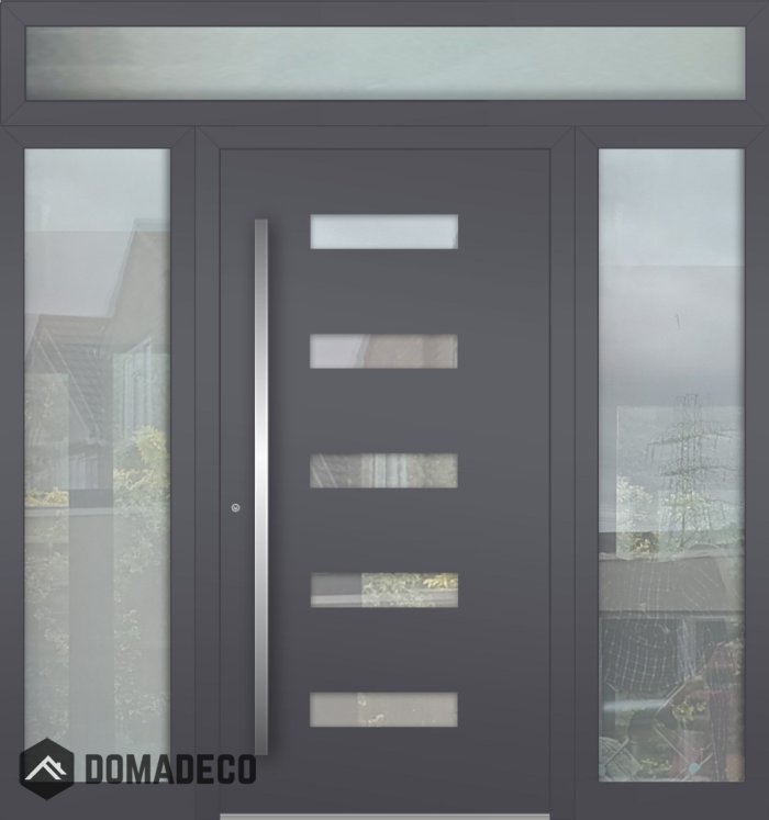 Aluminum LIM hinged front door with left, right and top glass panel