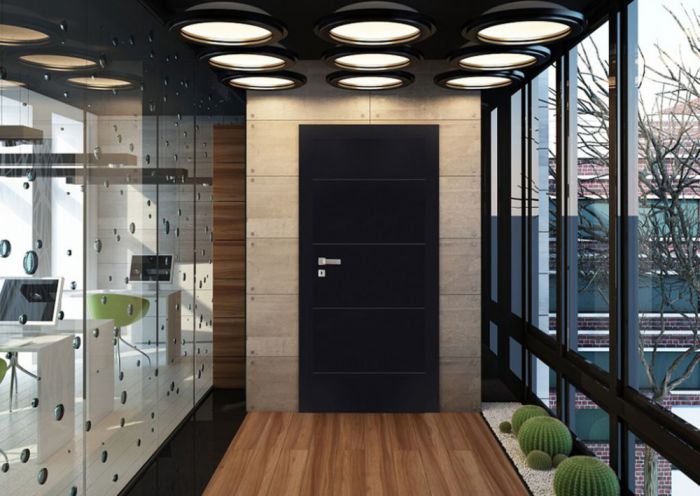 The door is made of a wooden rail and stile set topped with two HDF boards covered with ecological acrylic paint (RAL and NCS colour palette).